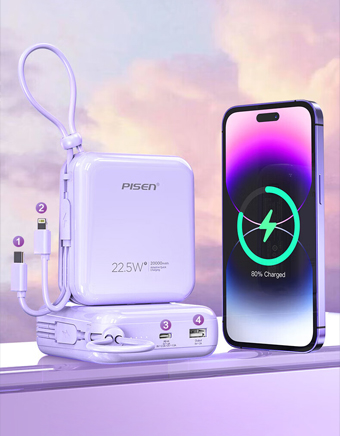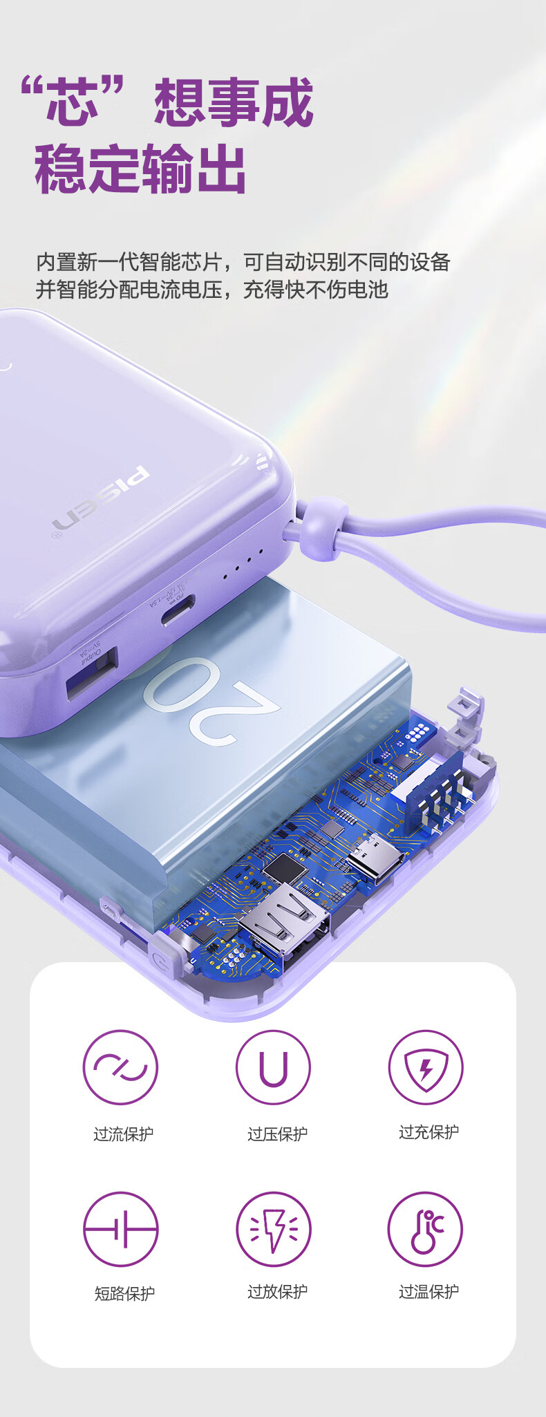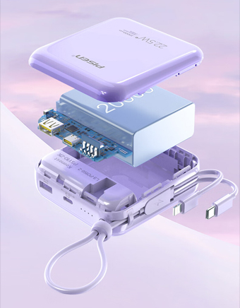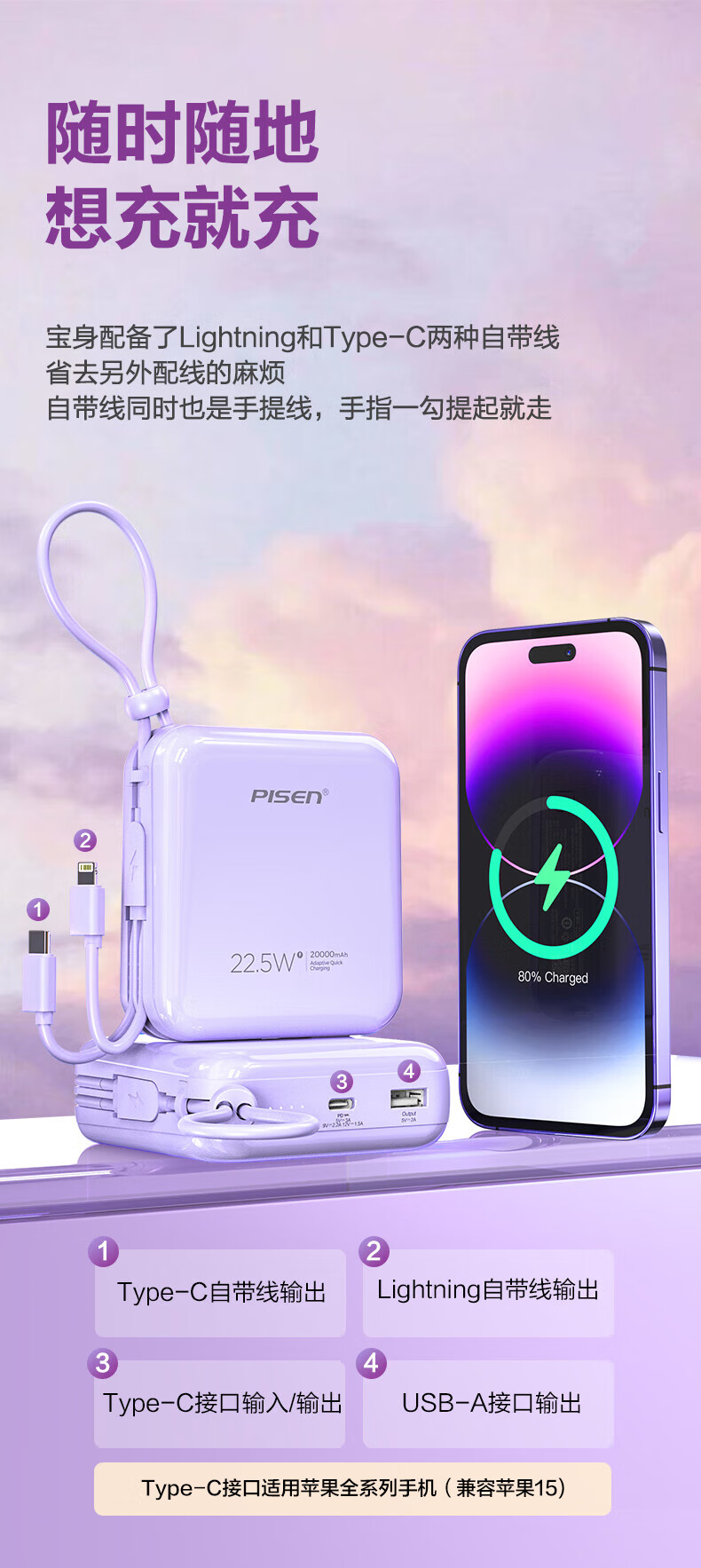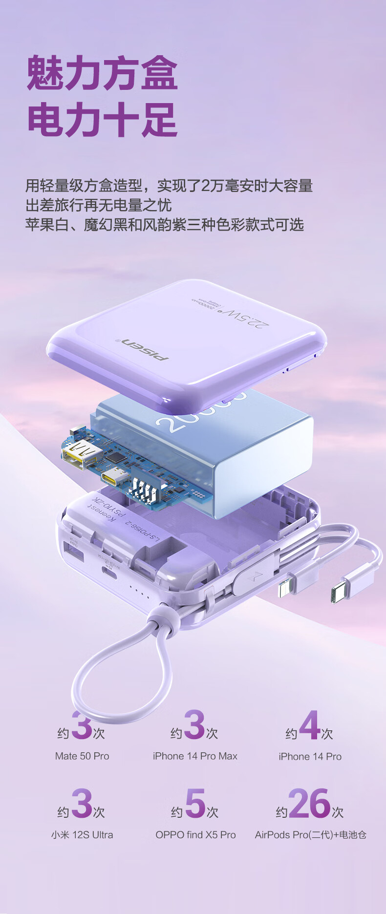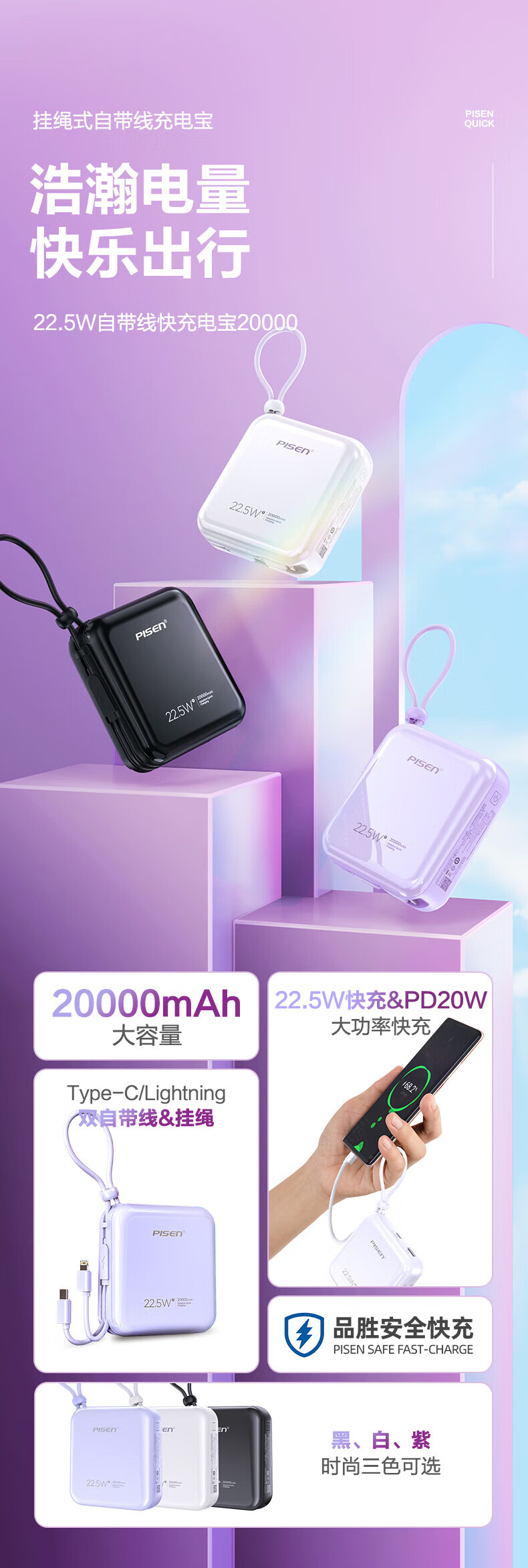 特色功能:轻薄便携,自带线,双向快充